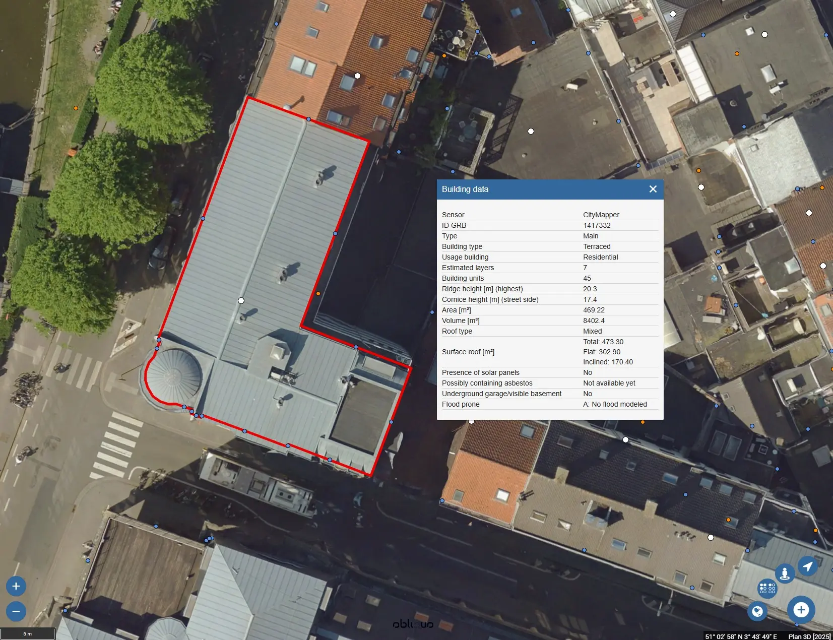 Met onze extra Big Data-services krijg je een compleet en gedetailleerd beeld van gebouwen, gevels, percelen en terreinen, verrijkt met berekeningen op basis van onze eigen LiDAR-luchtmetingen en officiële kaartlagen zoals GRB, PICC en URBIS. Onze datasets worden aangevuld met AI-gebaseerde analyses die automatisch zonnepanelen, asbestdaken en zwembaden detecteren, gecombineerd met gegevens uit externe bronnen. Deze verrijkte informatie is volledig geïntegreerd in de Plan3D Webviewer en kan als extra laag worden geactiveerd, zodat je alle inzichten rechtstreeks in de viewer kunt raadplegen en analyseren.